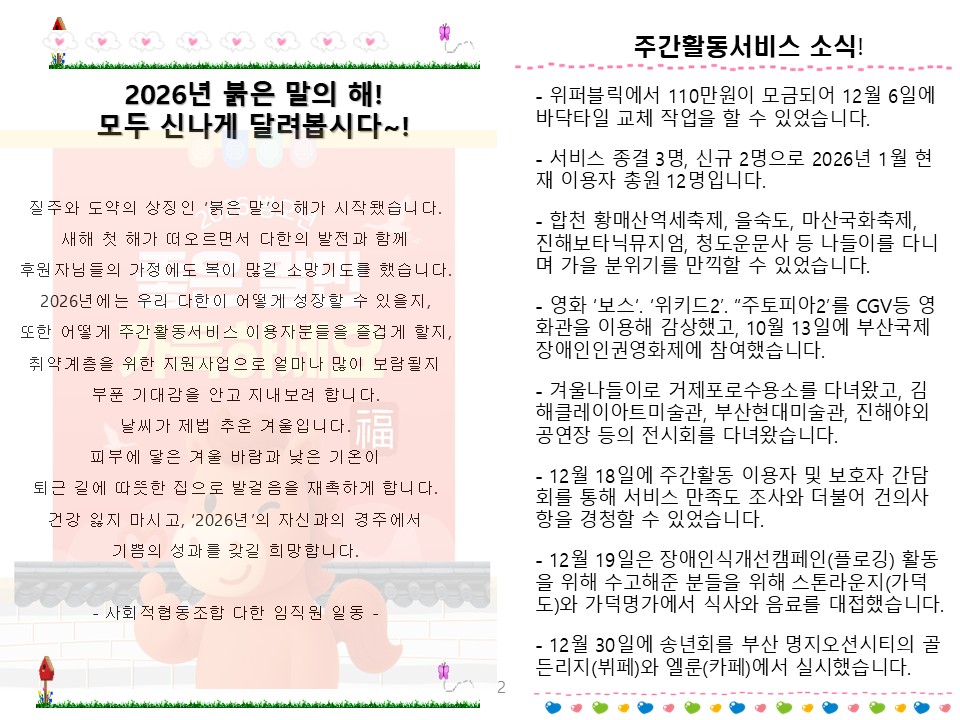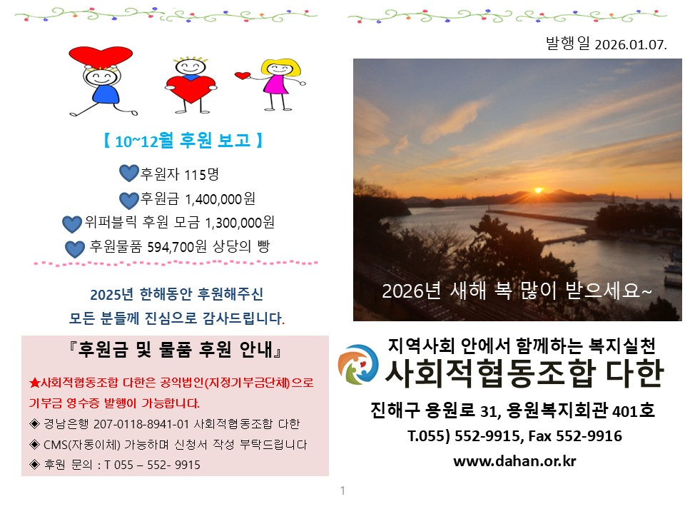 사회적협동조합 다한의 2026년 사업계획 및 예산안을 붙임과 같이 공시합니다.