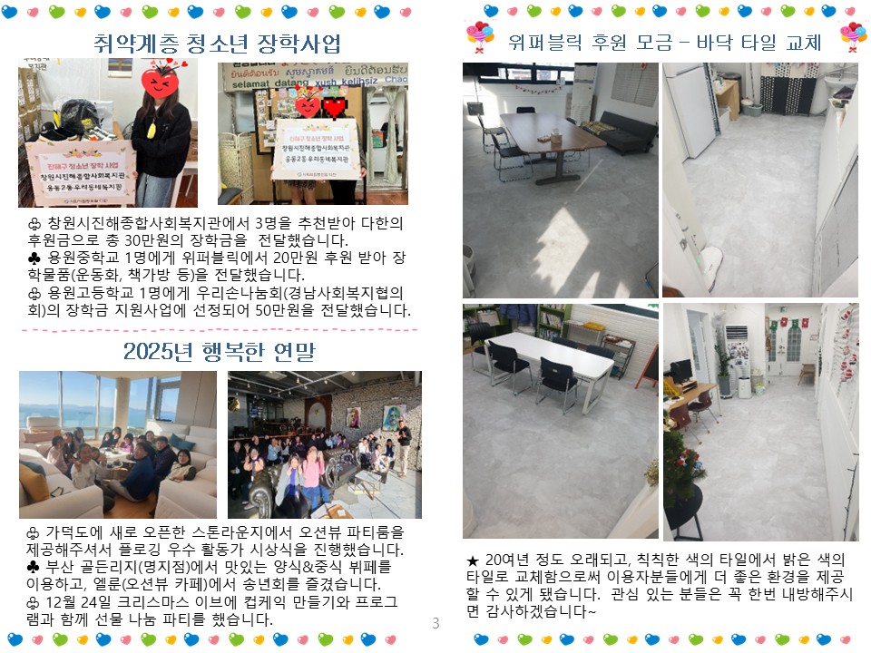 진해구에 거주하는 취약계층(기초수급, 차상위)세대, 복지사각지대(다자녀, 한부모, 다문화) 가정의 청소년을 지원하기 위해 기관의 소중한 후원금을 바탕으로 장학금 및 장학물품을 전달합니다.